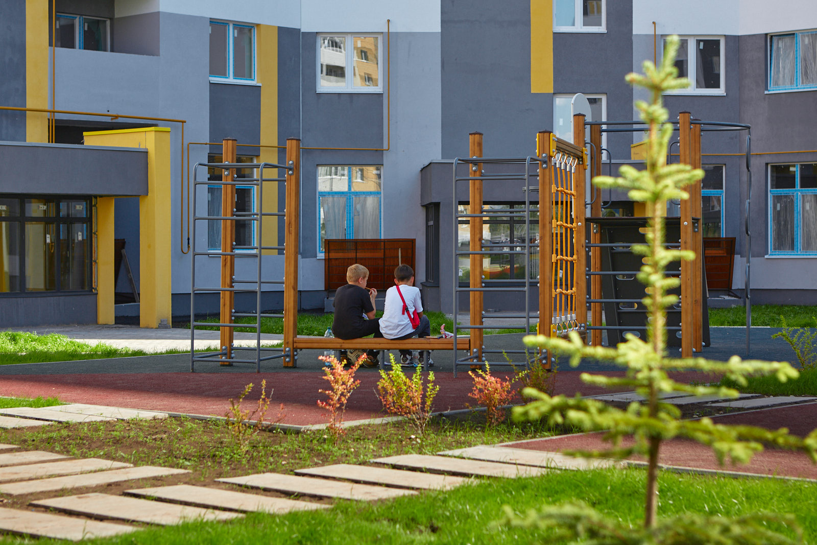 Между домами (во дворе) все дорожки и тротуары будут исключительно пешеходными. По центру двора мы предусмотрели своеобразный арт-объект в виде кольцевой скамейки, в центр которой жители в последствии могут посадить ёлку и наряжать ее зимой. Во дворе будет много детского и спортивного оборудования, включая волейбольную площадку.