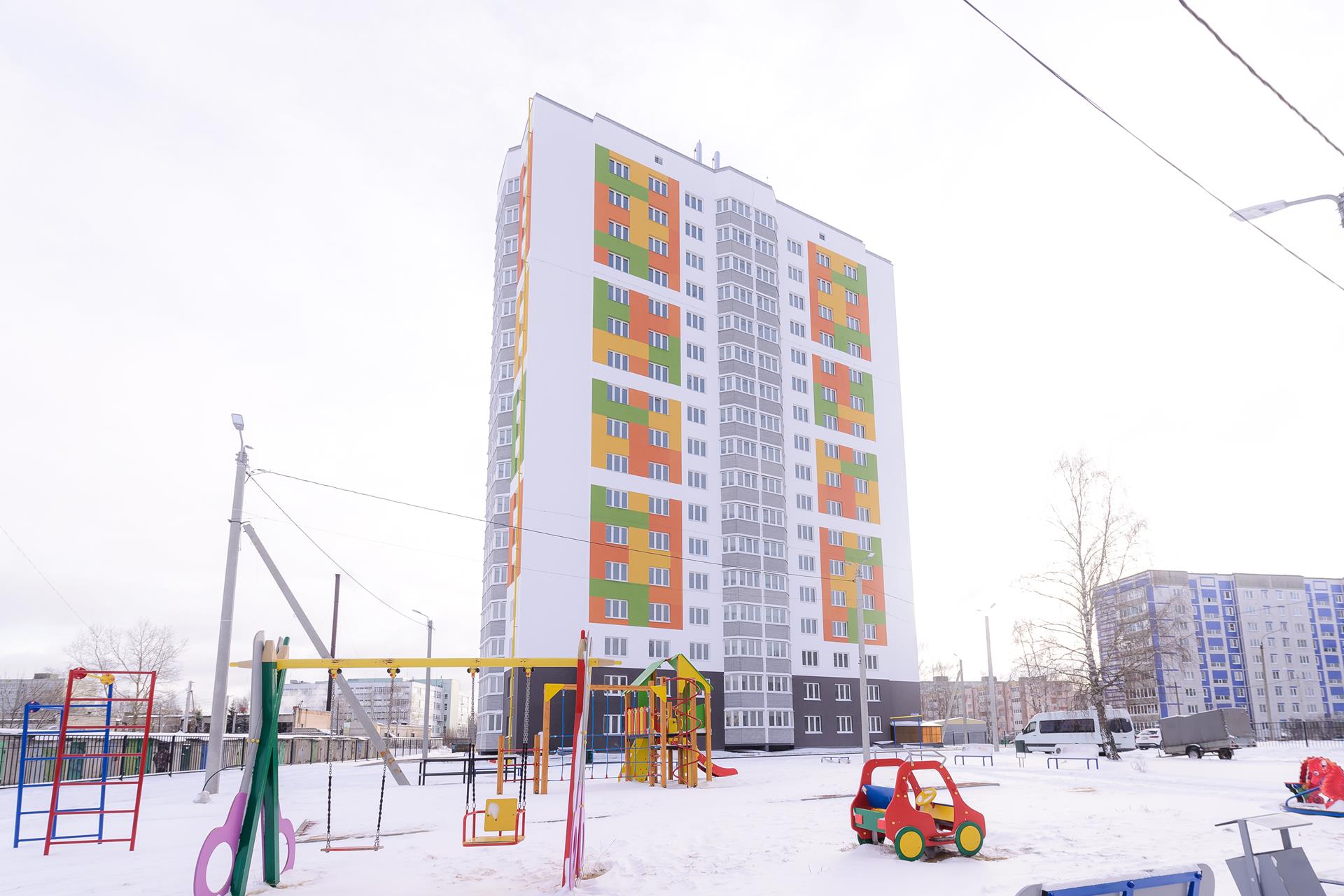 Между домами расположено 2 многофункциональные детские площадки в концепции жилого комплекса с частичным резиновым покрытием.