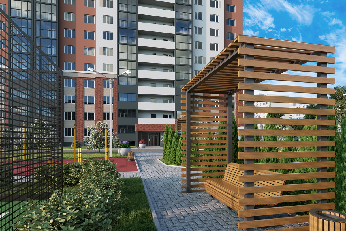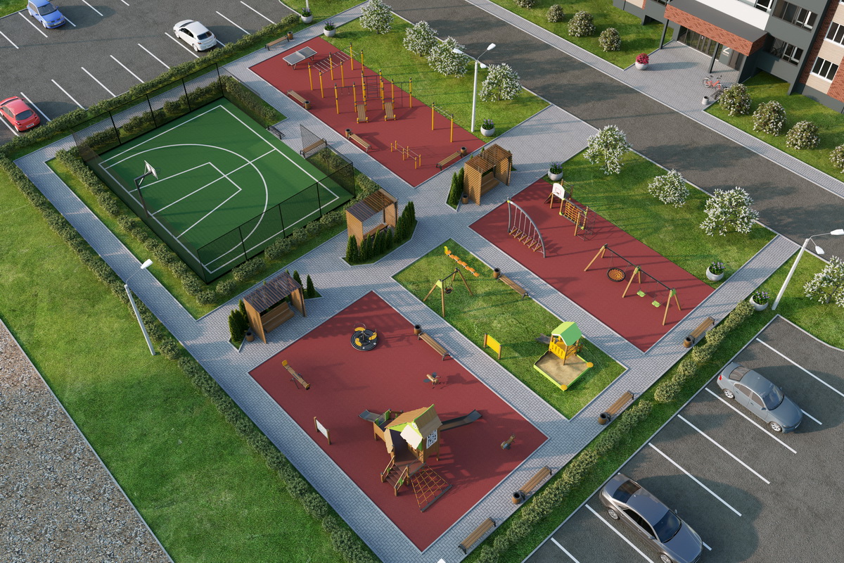 - Досуговую территорию мы разделили на 6 функциональных зон: огороженная спортивная площадка для стритбола с резиновым покрытием, спортивная зона для воркаута с резиновым покрытием, детская игровая площадка в ЭКО стиле с резиновым покрытием, детская игровая площадка с газоном для игры в песок, детская спортивная площадка с резиновым безопасным покрытием и мини-сквер с удобными парковыми диванами, окруженными зелеными туями.